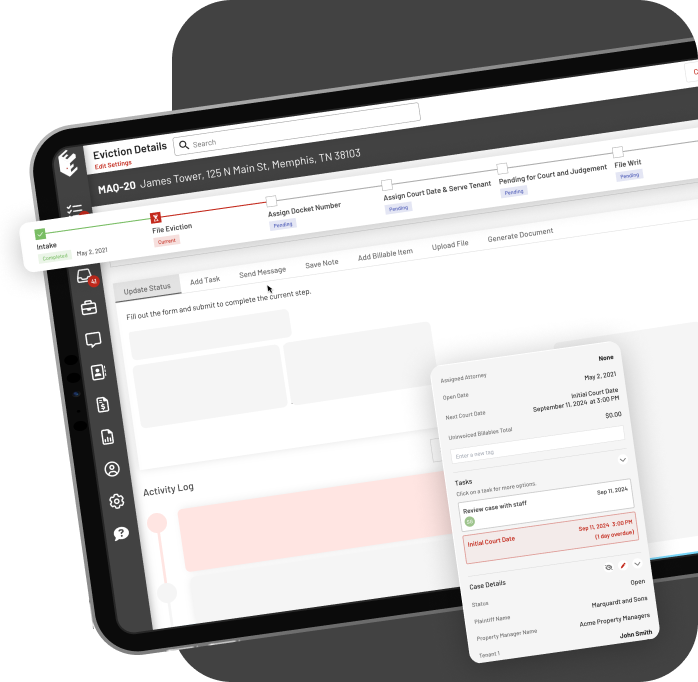 EasyEviction simplifies the eviction process, providing you with increased efficiency and visibility. With automatic notifications, tracking, billing, and more built into the program, the eviction process will never be the same — and that’s a good thing for both attorneys and their property manager clients.